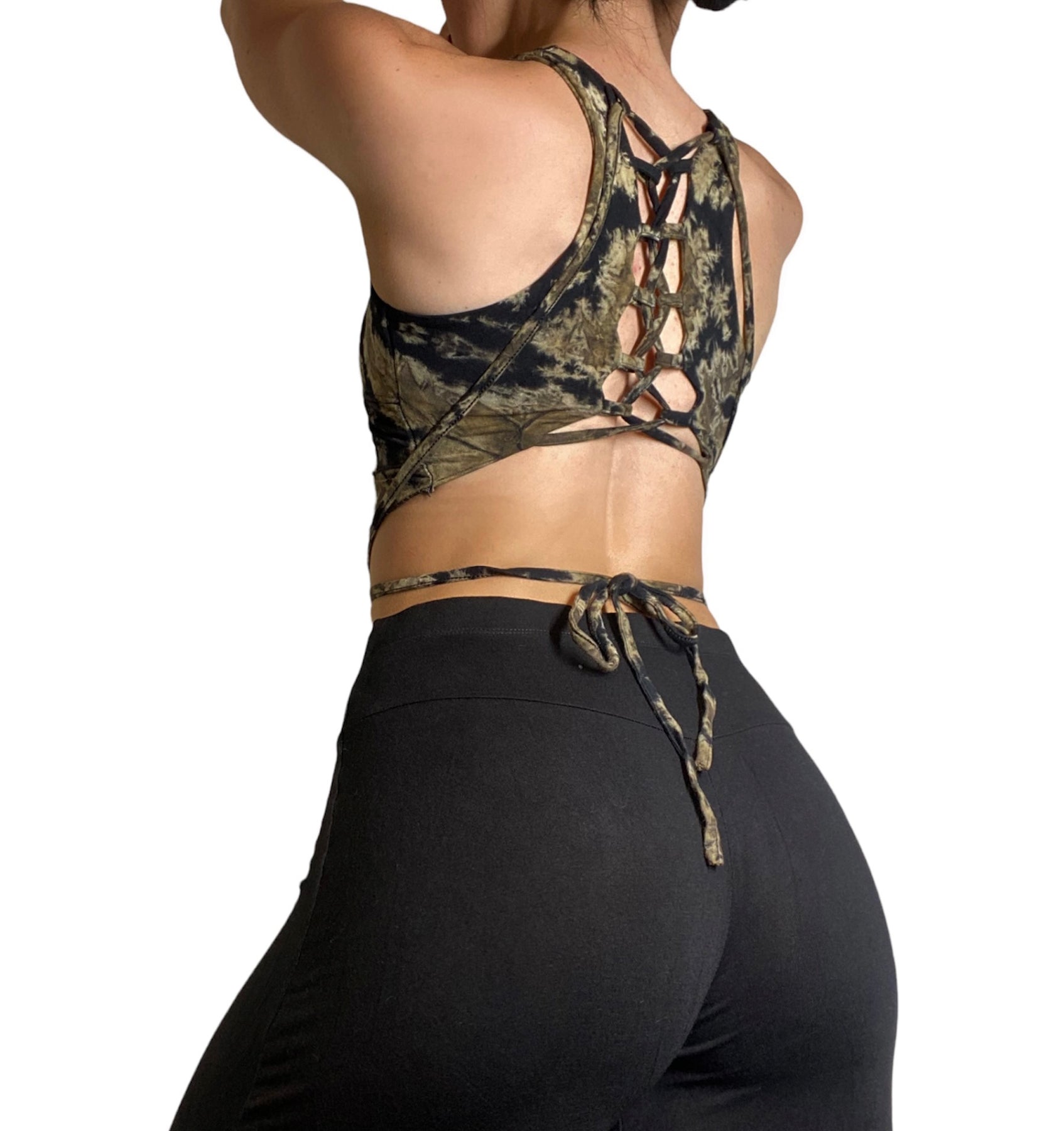 Model in Black/Olive Tie Dye top is 5'2 tall and 120 lbs.