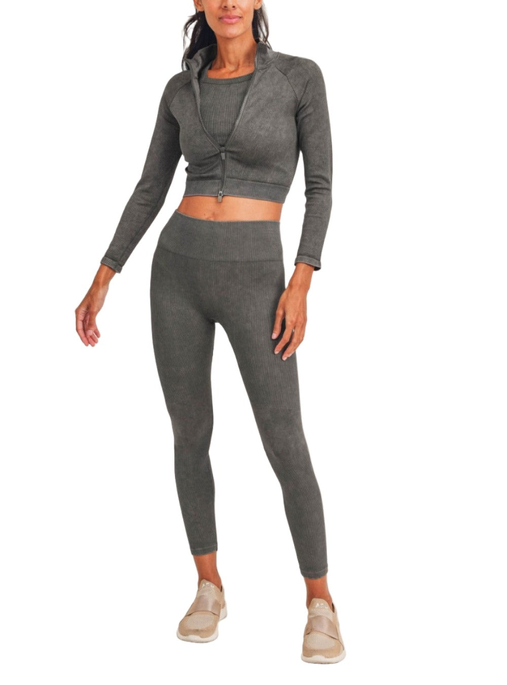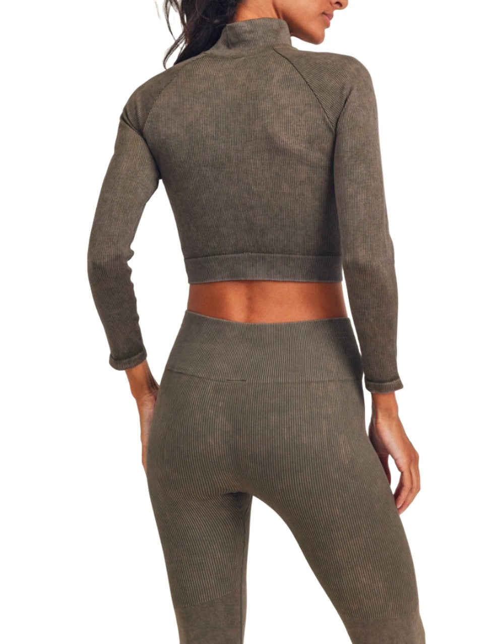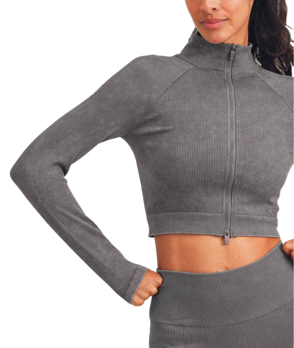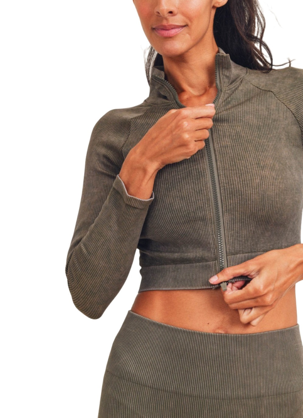 Form fitted ribbed jacket with a high neck and long raglan sleeves! Comfortable and stretchy fit!
