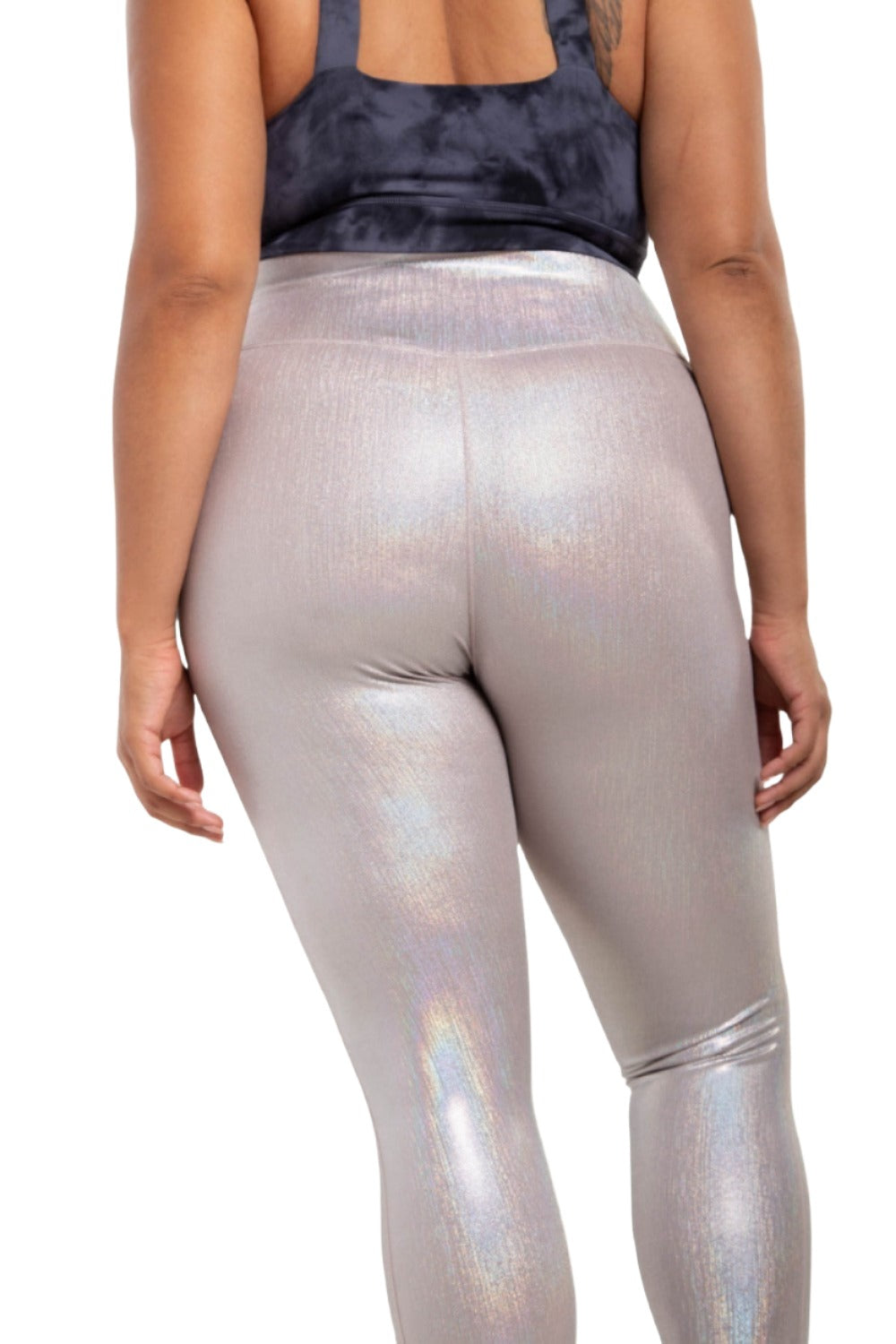 These iridescent foil leggings were constructed using our Nylon/Lycra blend for exceptional stretch and are high waisted to offer ab support.