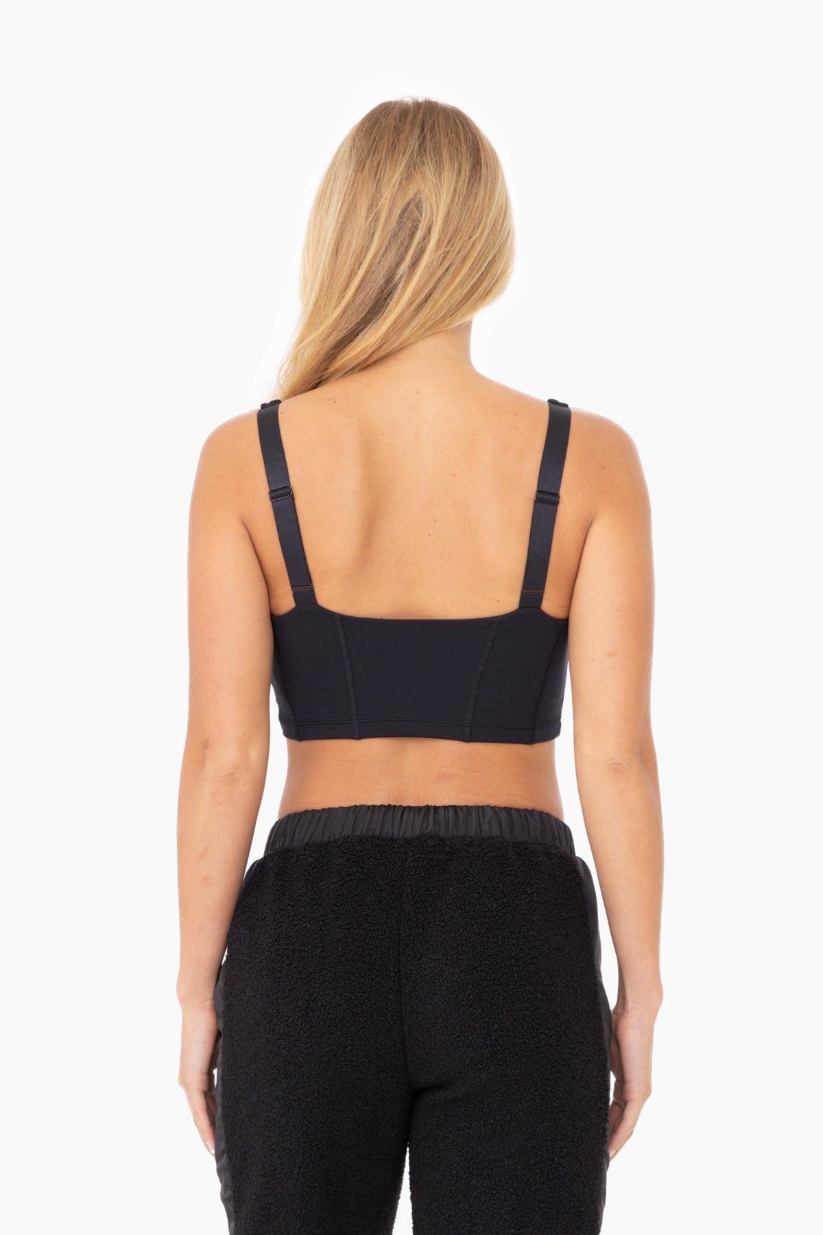 This sports bra features a panel-blocking design for a more streamlined silhouette and has adjustable straps