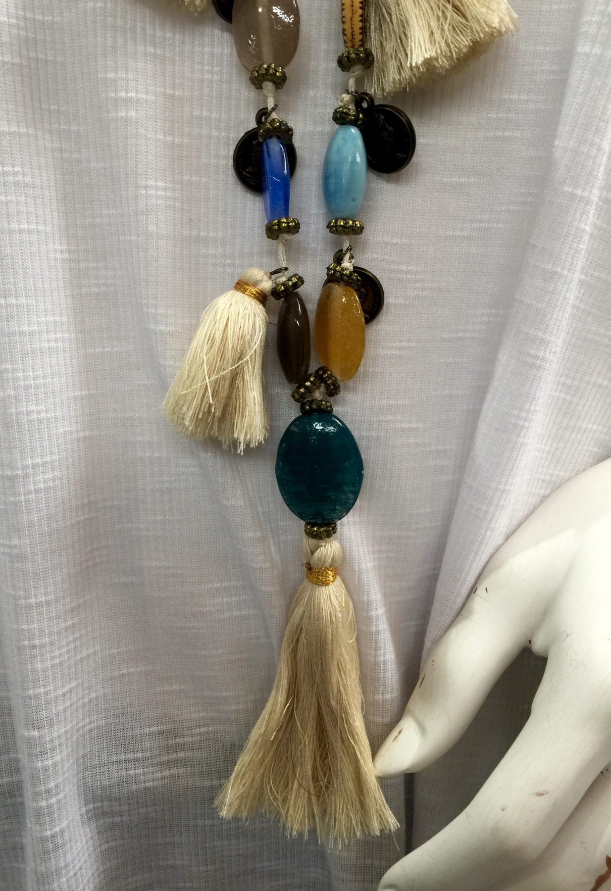 Tassels made from wool are the main feature of this necklace. We offer a wide variety of precious and unique necklaces. We work and handle several materials to make it a precious collection. In this case, artisans using organic wool made this necklace. I created this tassel necklace from a beautiful, large bead ball. Of course, it could be a wonderful gift for yourself.