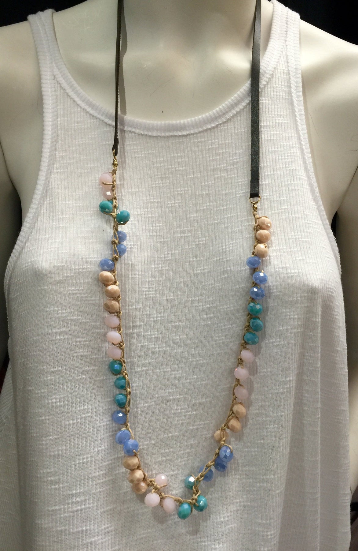 Leather and crystals measuring 36 inches, so hangs 18 inches on the neck and a leather rear strap