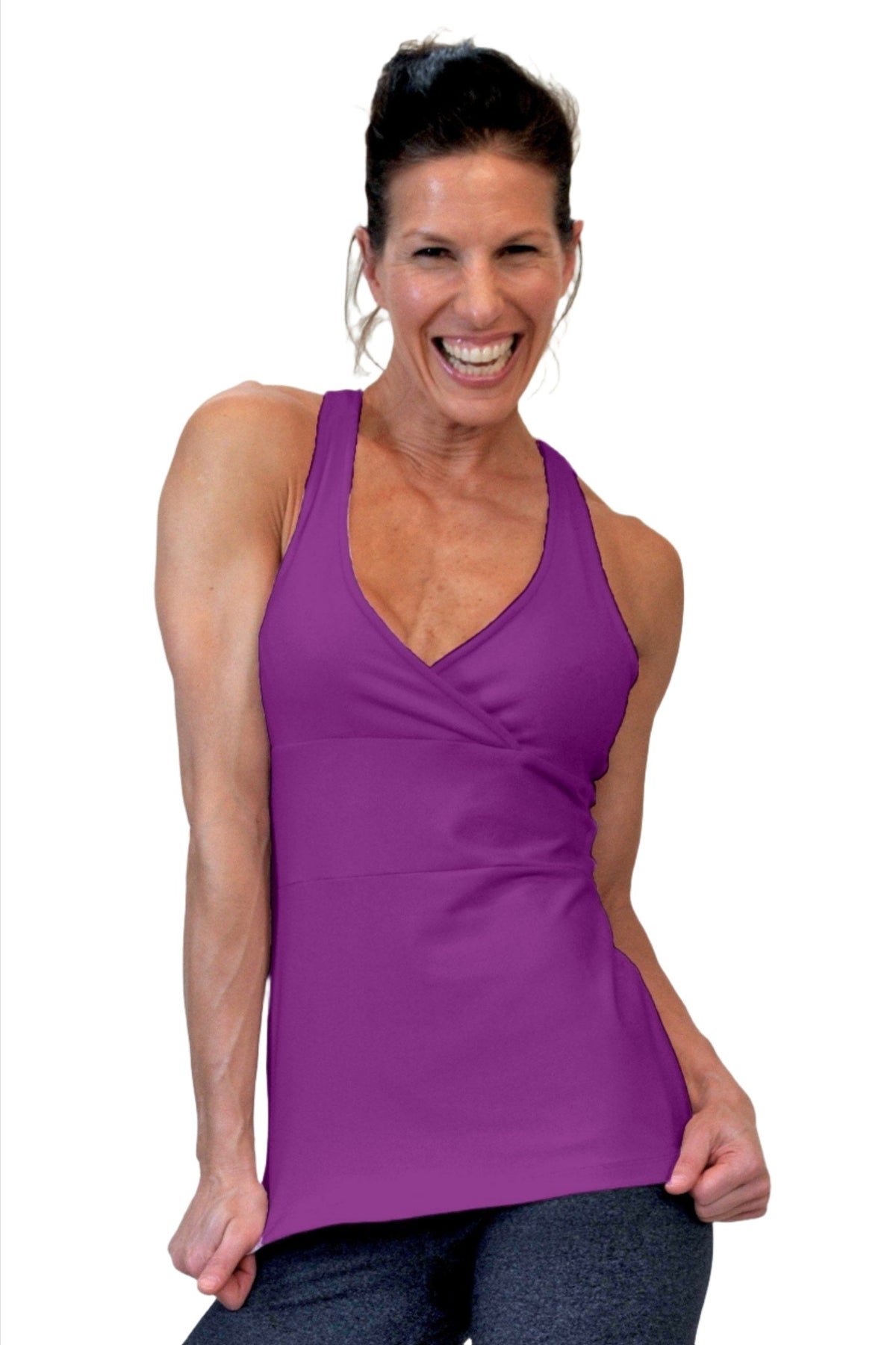 A double reinforced waistband gives this tank extra va-va-voom! The seaming around the waist is so flattering - it will make your waist look smaller! A crossover V front will top off your workout with maximum cuteness!