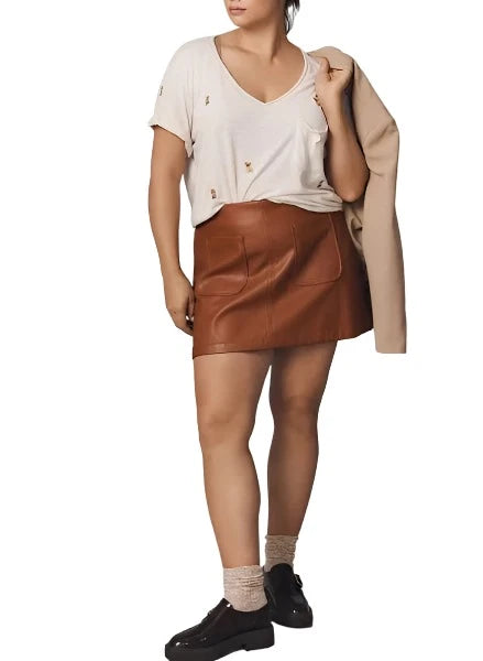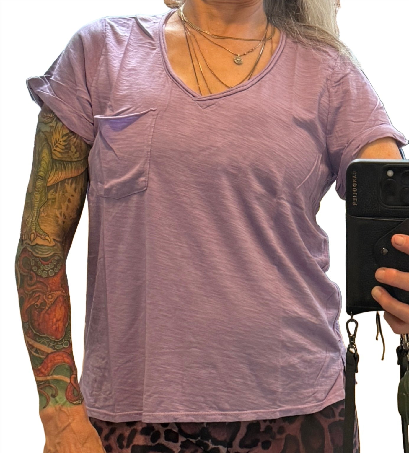 I love the fit of this T-Shirt. The V-Neck and rolled sleeves are super cute. The length is not too long, which I like. The only thing that bothers me is that the pocket flaps open, there's a little too much material. I will probably add a stitch so that it doesn't flap open as much. It would be better if it didn't have the pocket, or it was a tighter opening on the pocket. It's a good quality shirt.