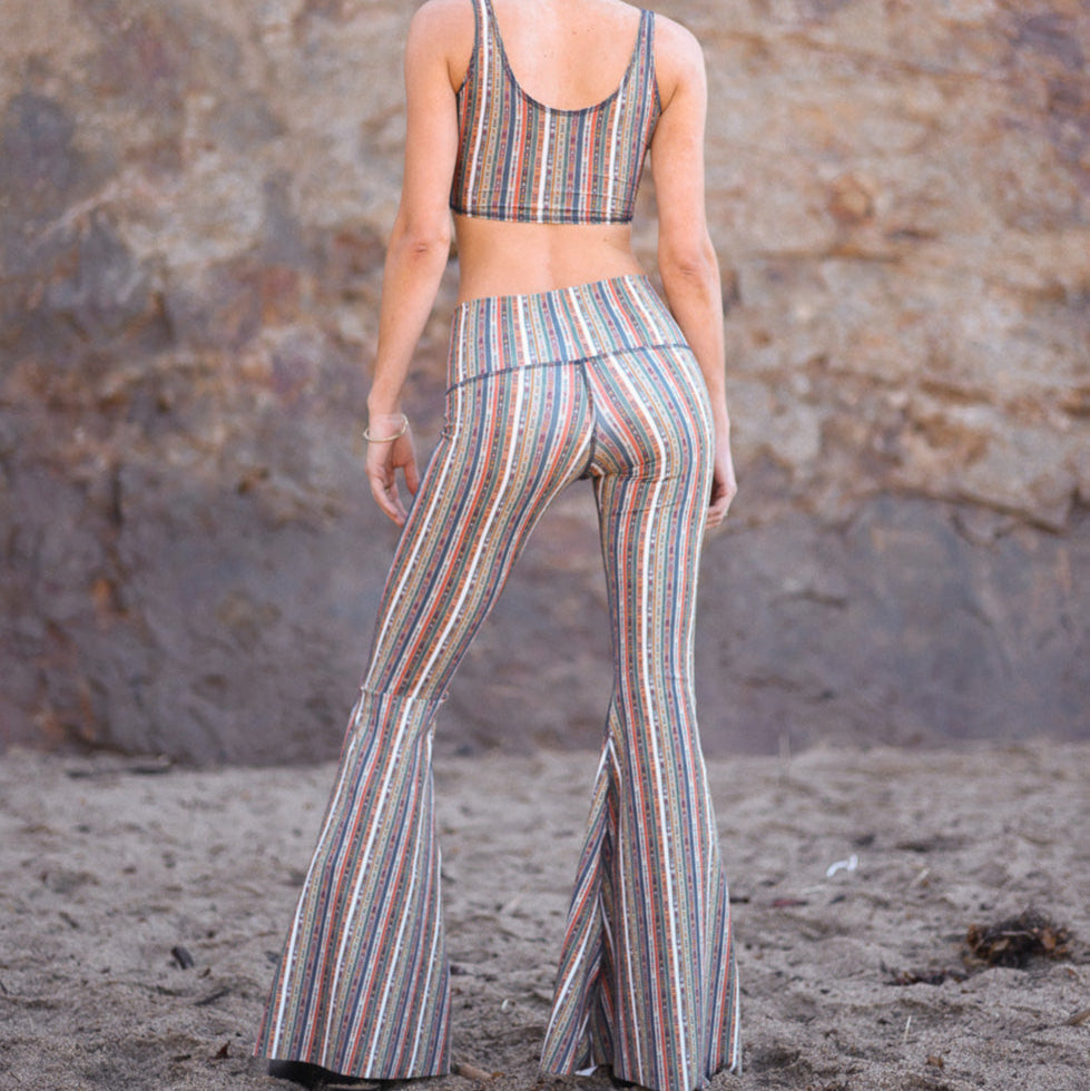 The wide waistband is thoughtfully designed to flatter bodies of all shapes and sizes, offering a comfortable fit whether worn folded down or up. Embrace ease of movement without compromising style, making these bell bottoms ideal for fashion and function.