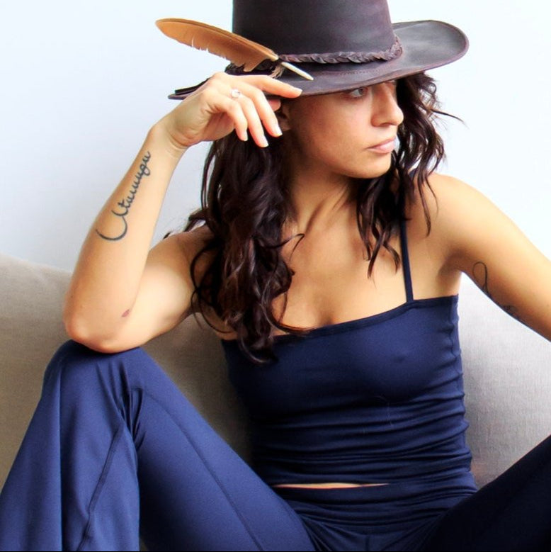 80% Recycled Poly, 12% Spun Poly, and 8% Spandex. Made for supreme comfort, free from bulk, nylon, and pilling. The fabric offers a soft, low-impact support and flowy drape. Since the fabric is softer and thicker than the Lover tanks the feel can be a little thicker. Hand Wash, Hang Dry.