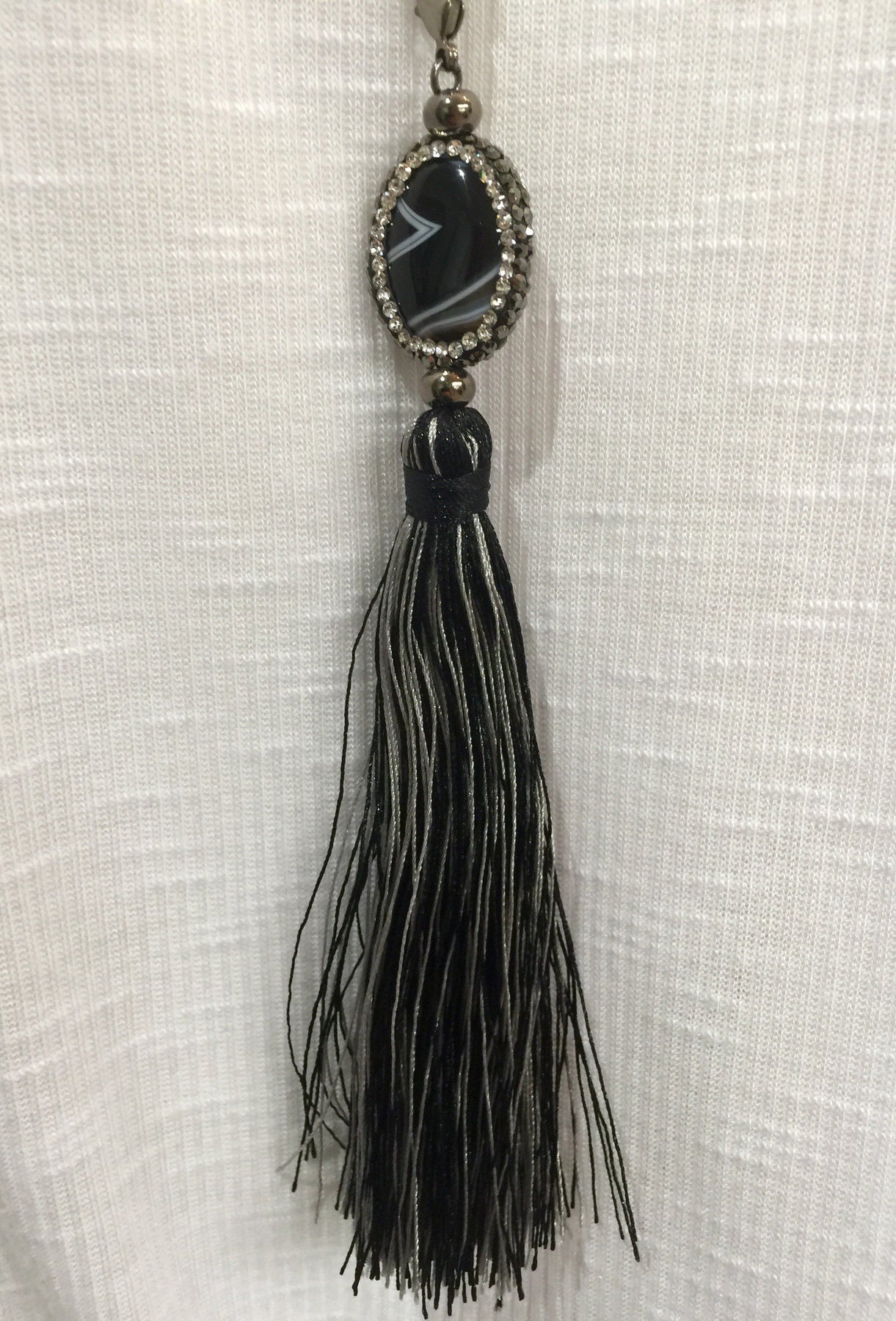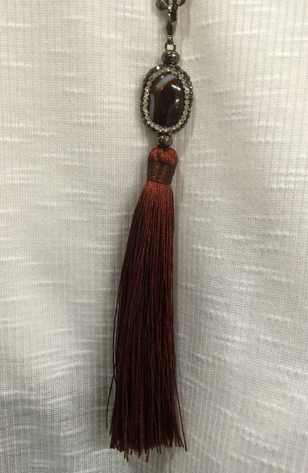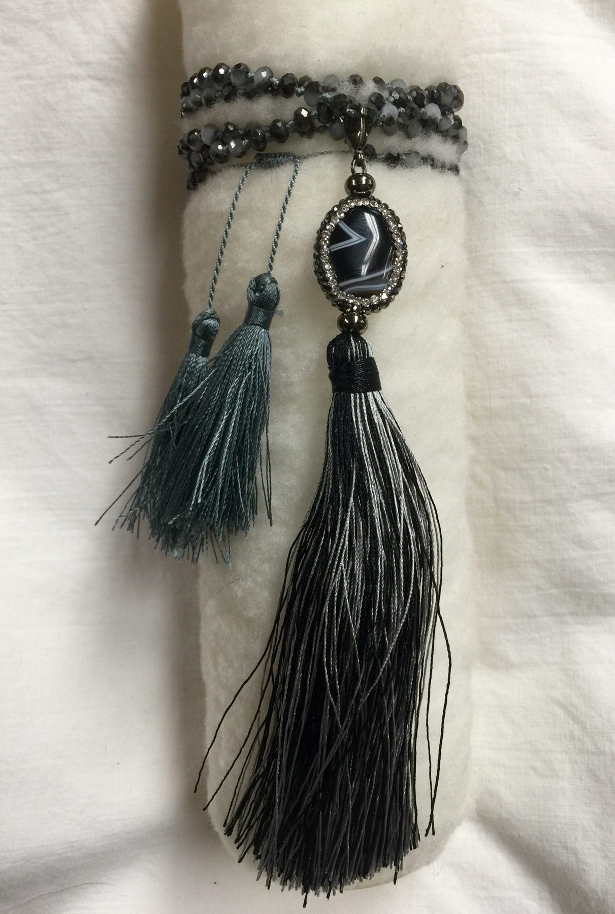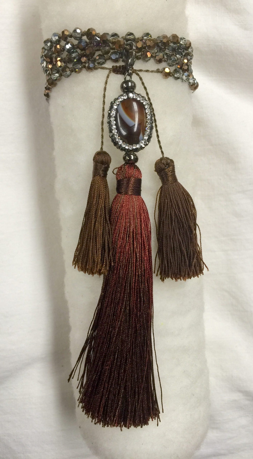 A Real Agate pendant can spice up your outfit it's a removable dangle tassel. When Tassels fall out of fashion it can be removed with an attached clasp. The entire necklace is faceted crystal. Very versatile, the back of the necklace is adjustable so it wraps well as a bracelet