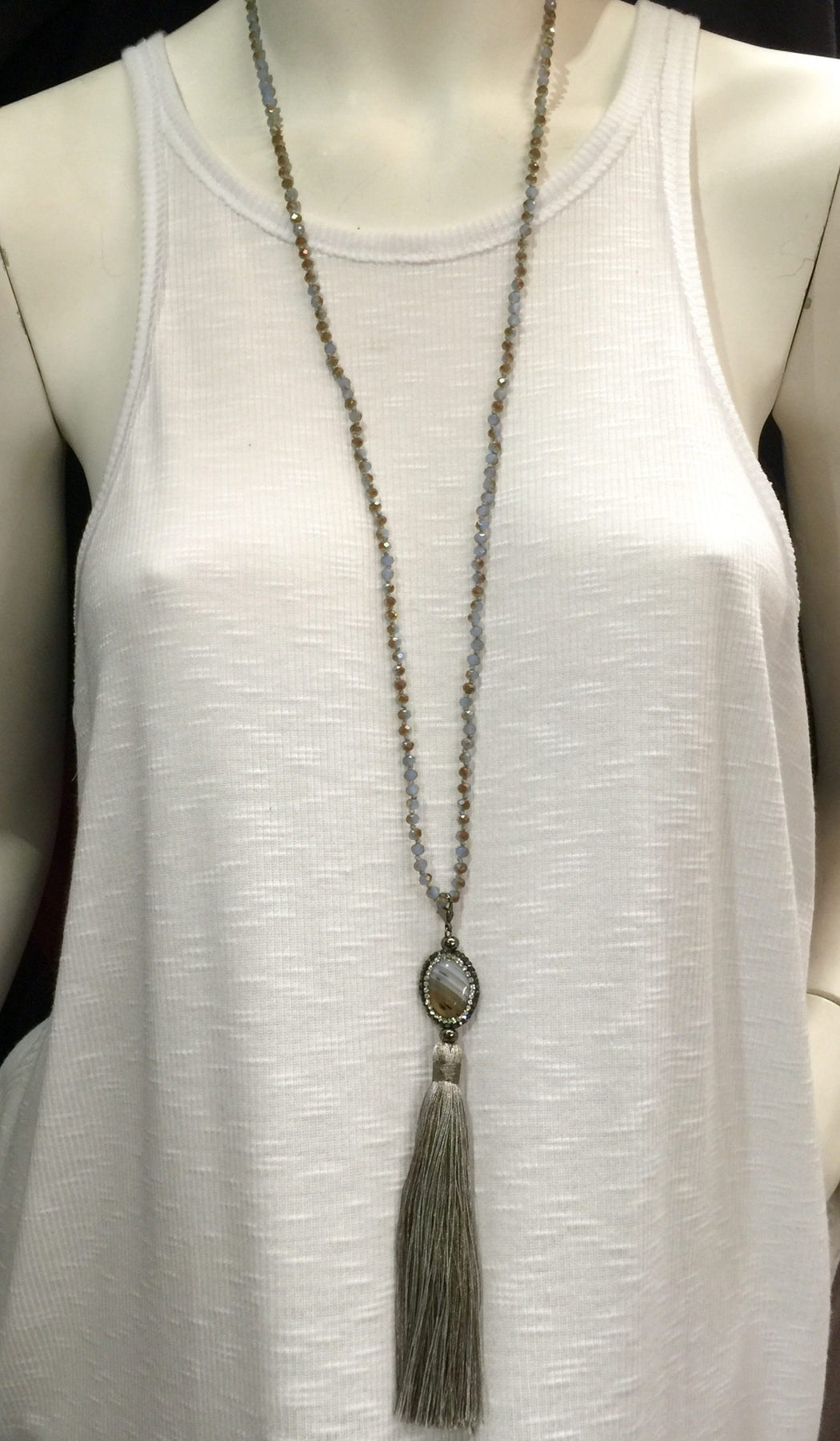 Agate and Crystal Long Tassel Necklace  - White/Gray