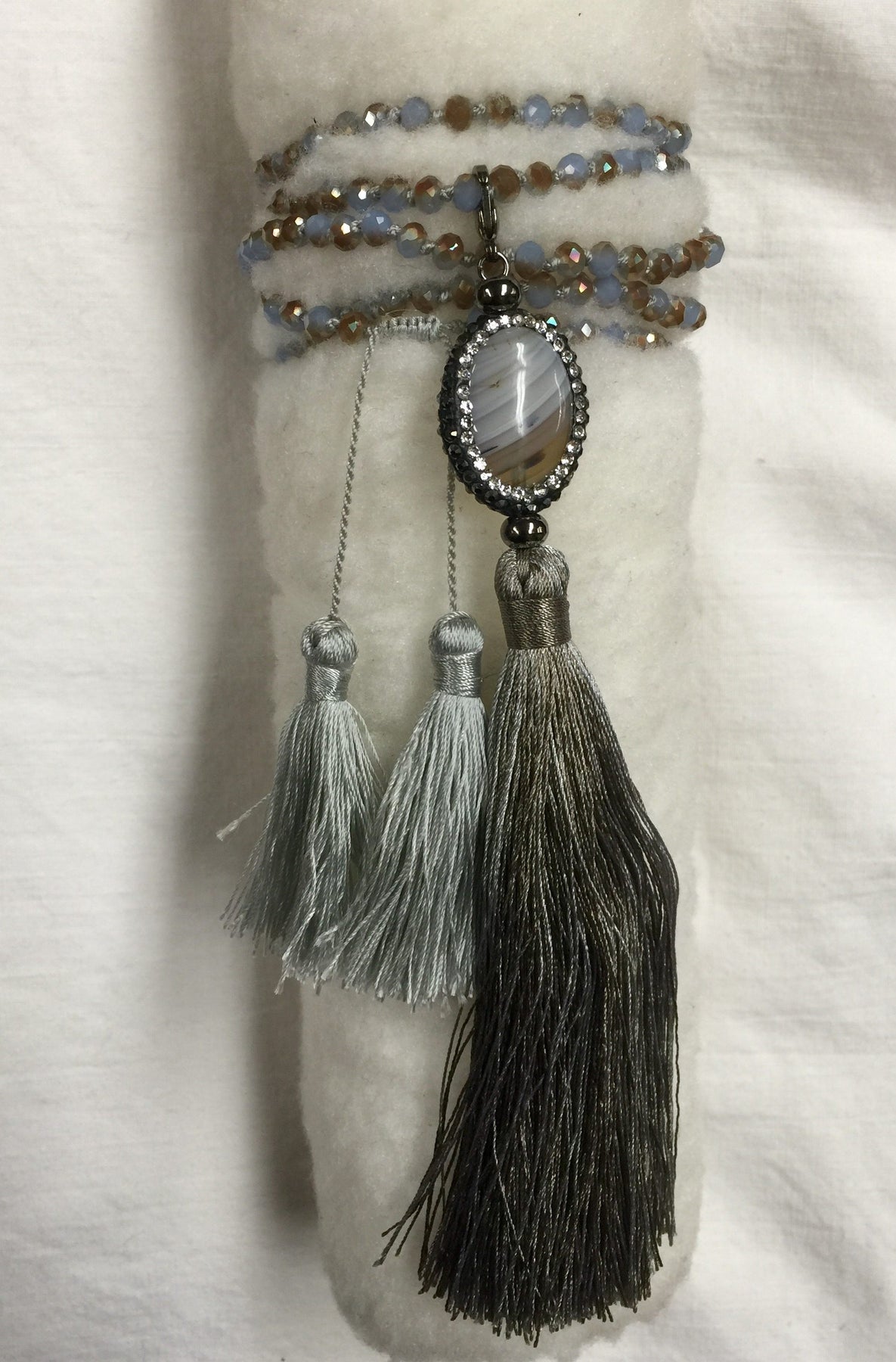 Convertible Agate Necklace with Adjustable slider Tassels and removable Dangle Tassel