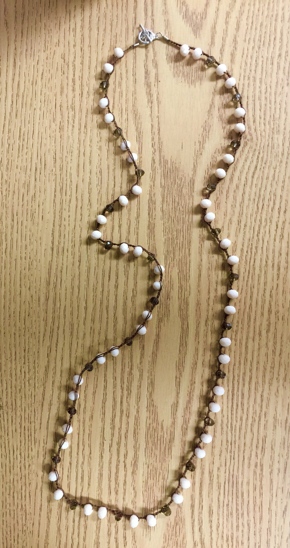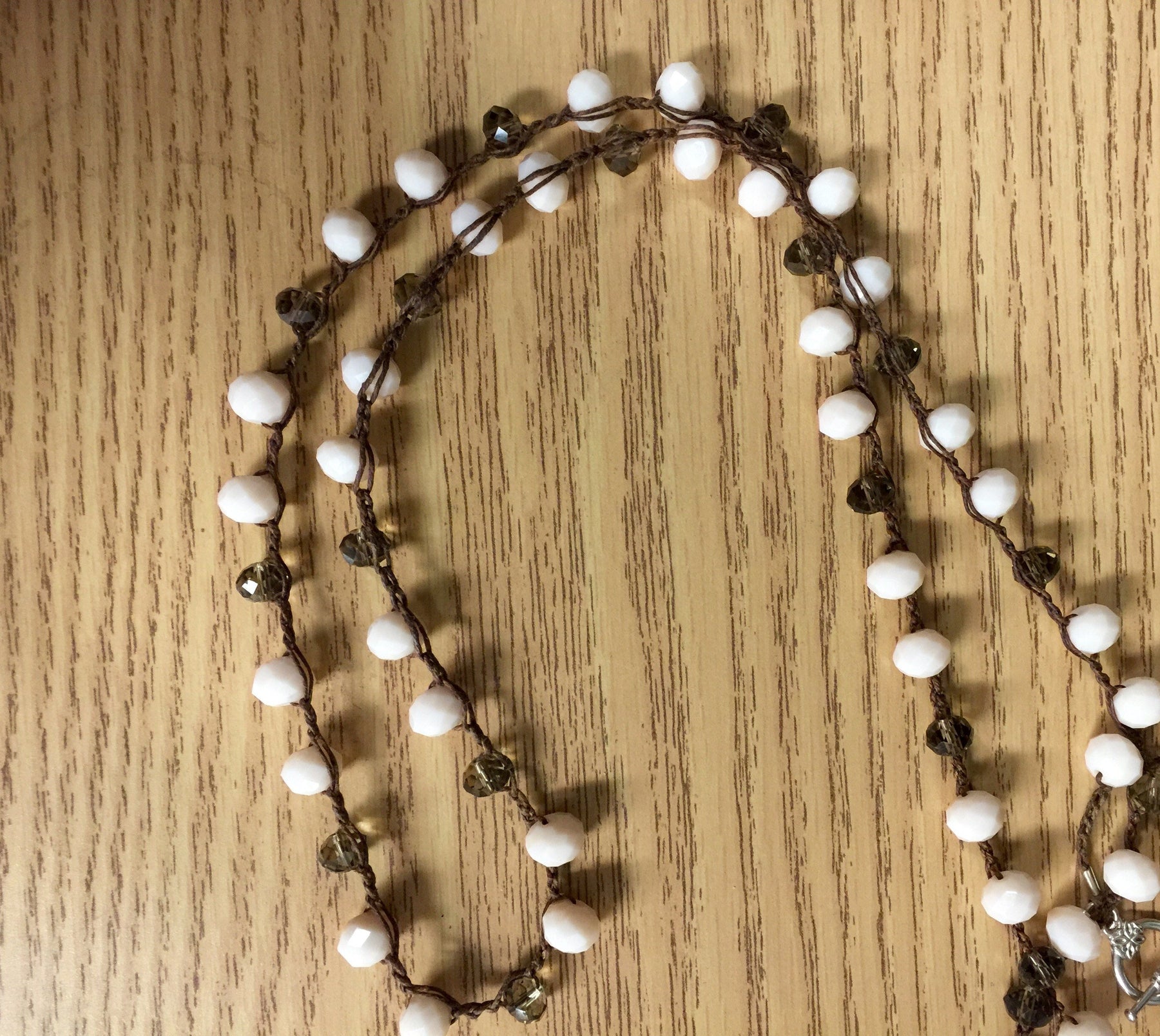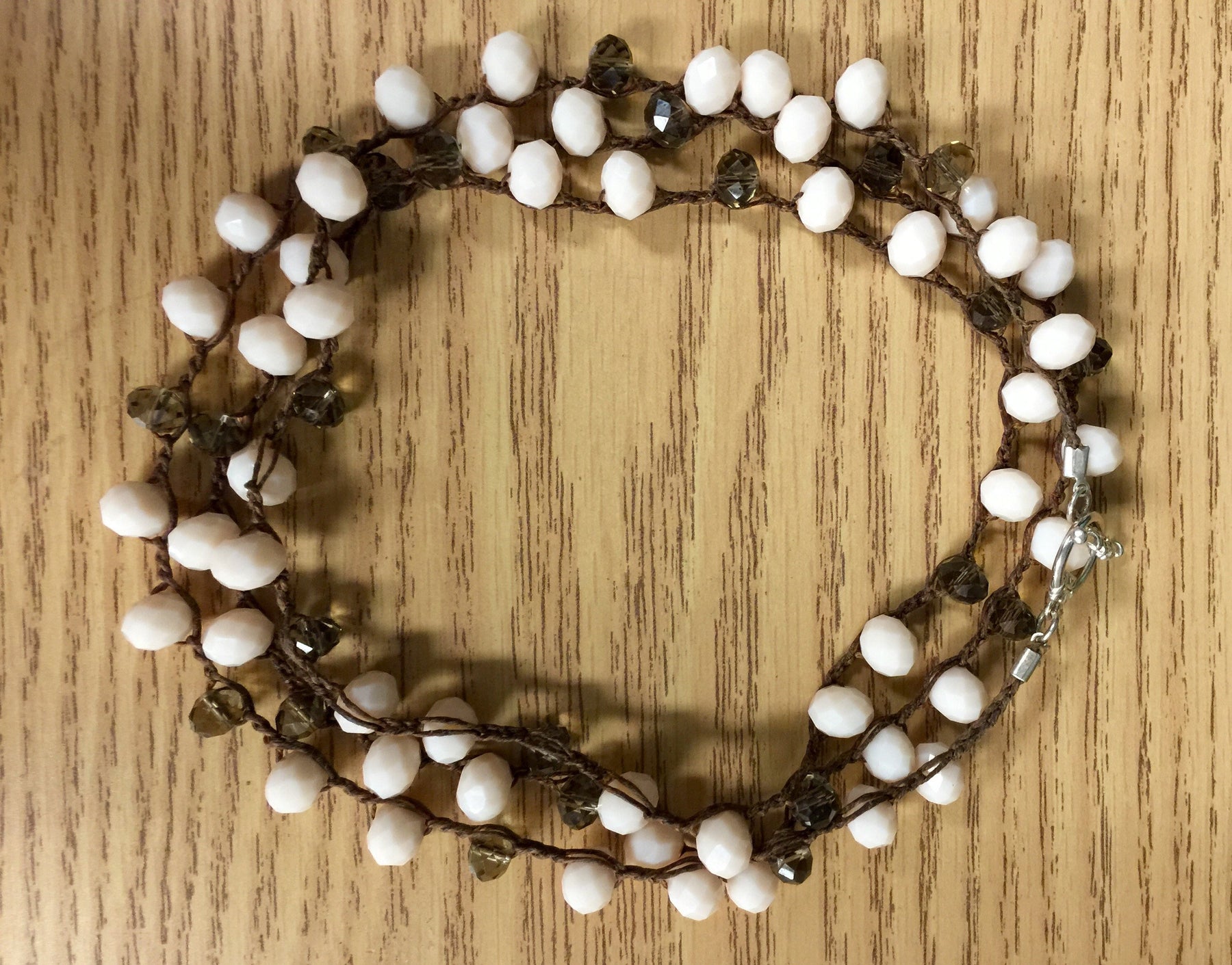Hand-crocheted necklace with 12mm smoky topaz crystal on brown string and Ballet Pink Quartz stones . Approximately 41" long when laid flat. Made in the USA.
