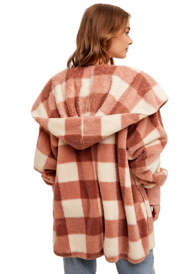 Hem & Thread Multi Color Checker Oversized Fuzzy Hooded Jacket 31296W