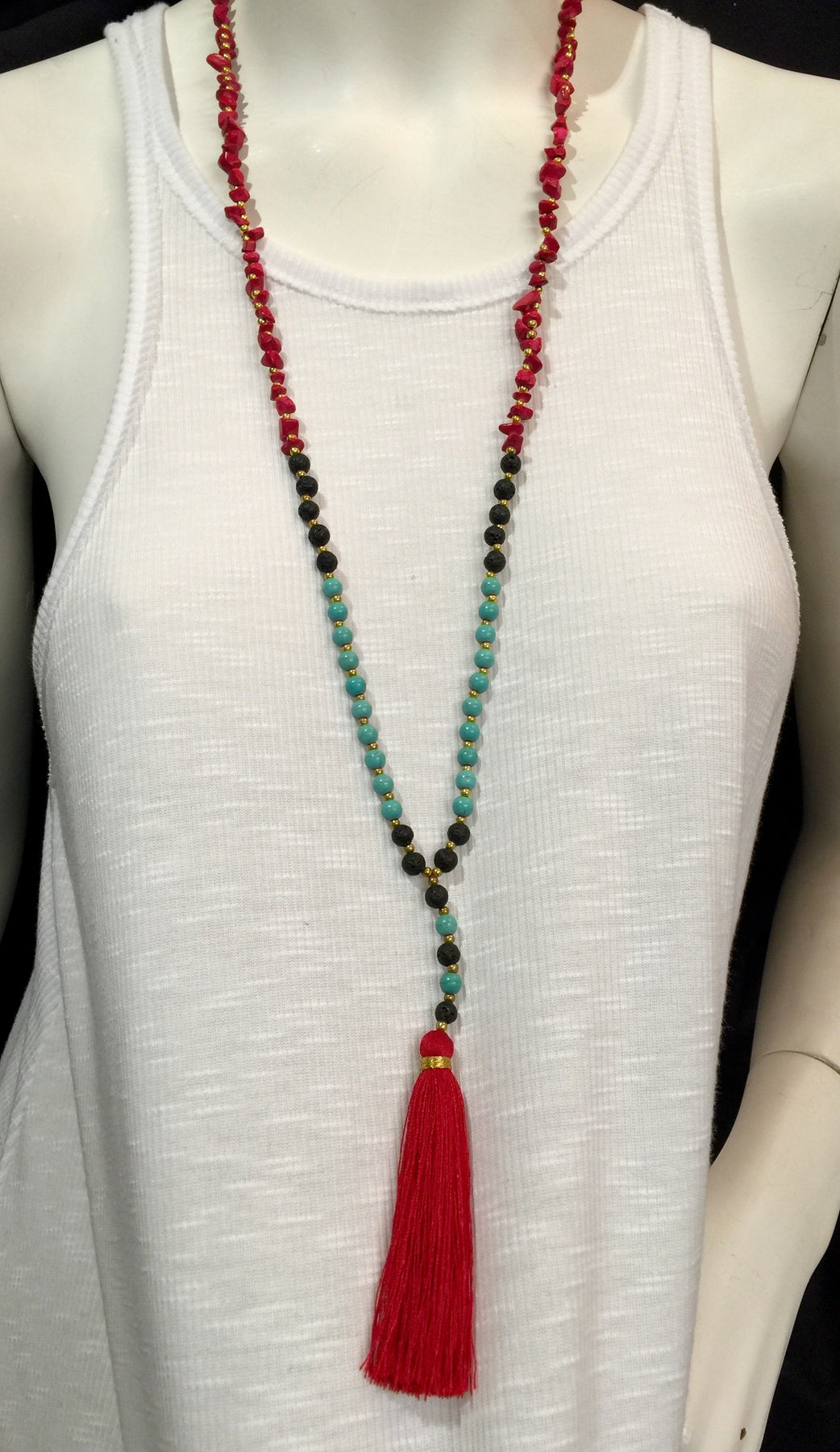 Wear this amazing tassel necklace! Made from a variety of stone chips, brass spacers, lava beads and a tassel for good luck!