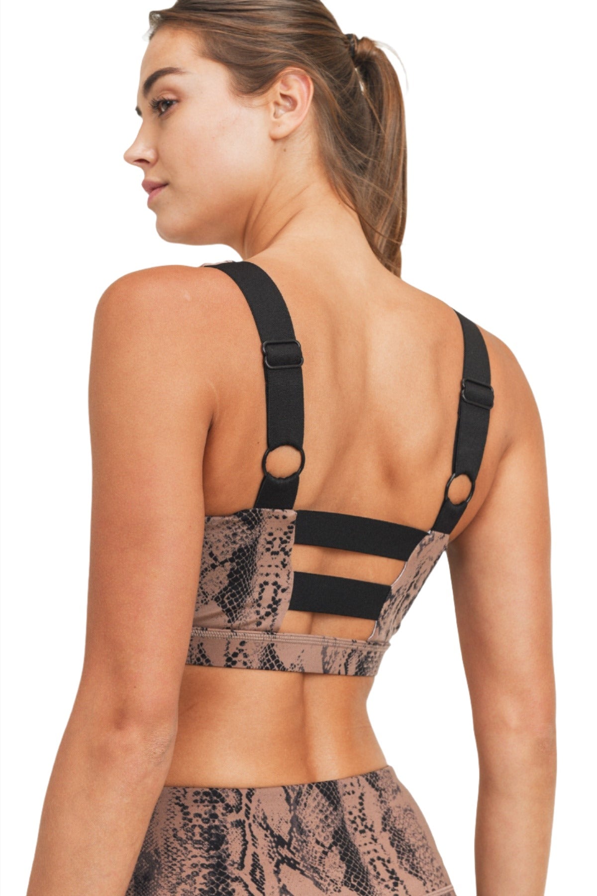 Crafted from the Mono B exclusive Mocha Snake print, this sports bra features adjustable straps for a unique and totally chic look.