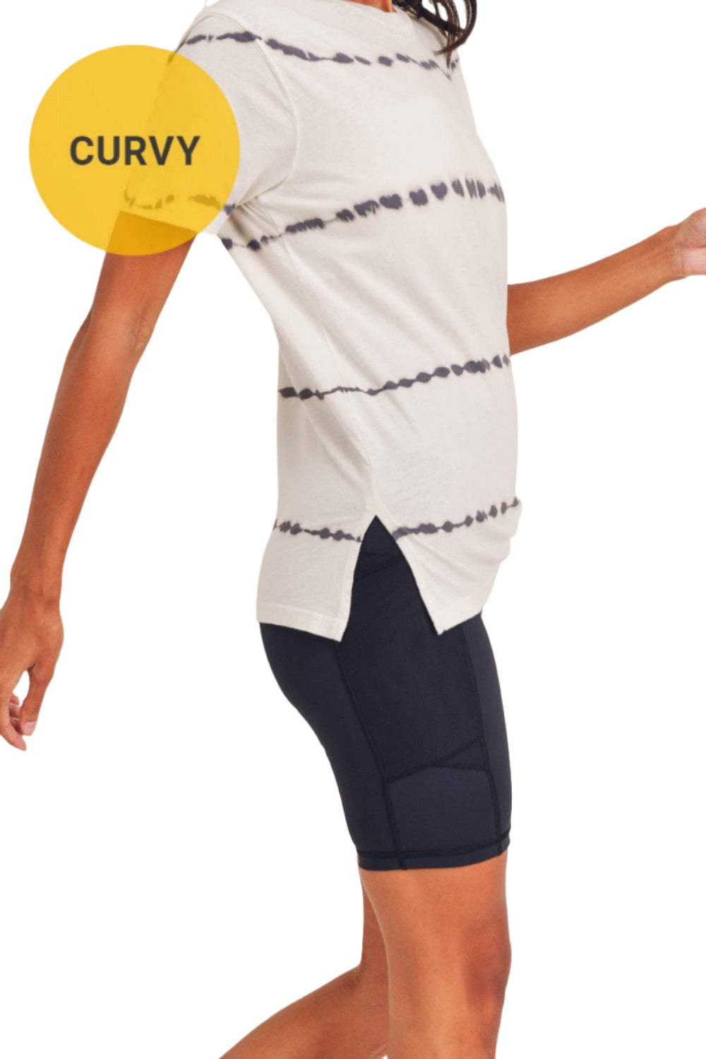 Constructed from 100% breathable cotton, this slightly loose tee has mid-length sleeves, a round neckline, a notch on each side, and unique dotted tie-dye stripes that go around the body and the sleeves.