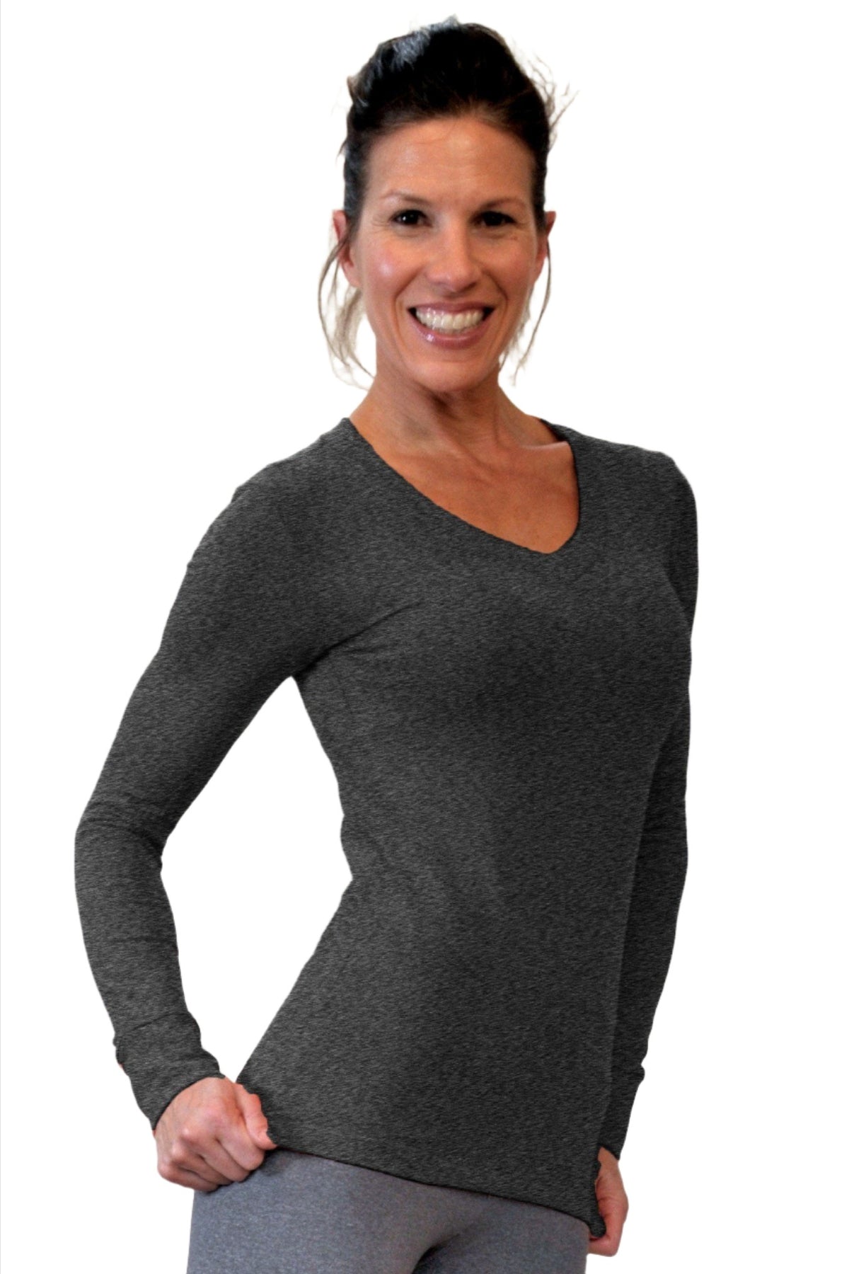 This sweet long sleeve has a V neck. Go for a run, and pull on this snug top when you're done - no worry of the post-workout chills!